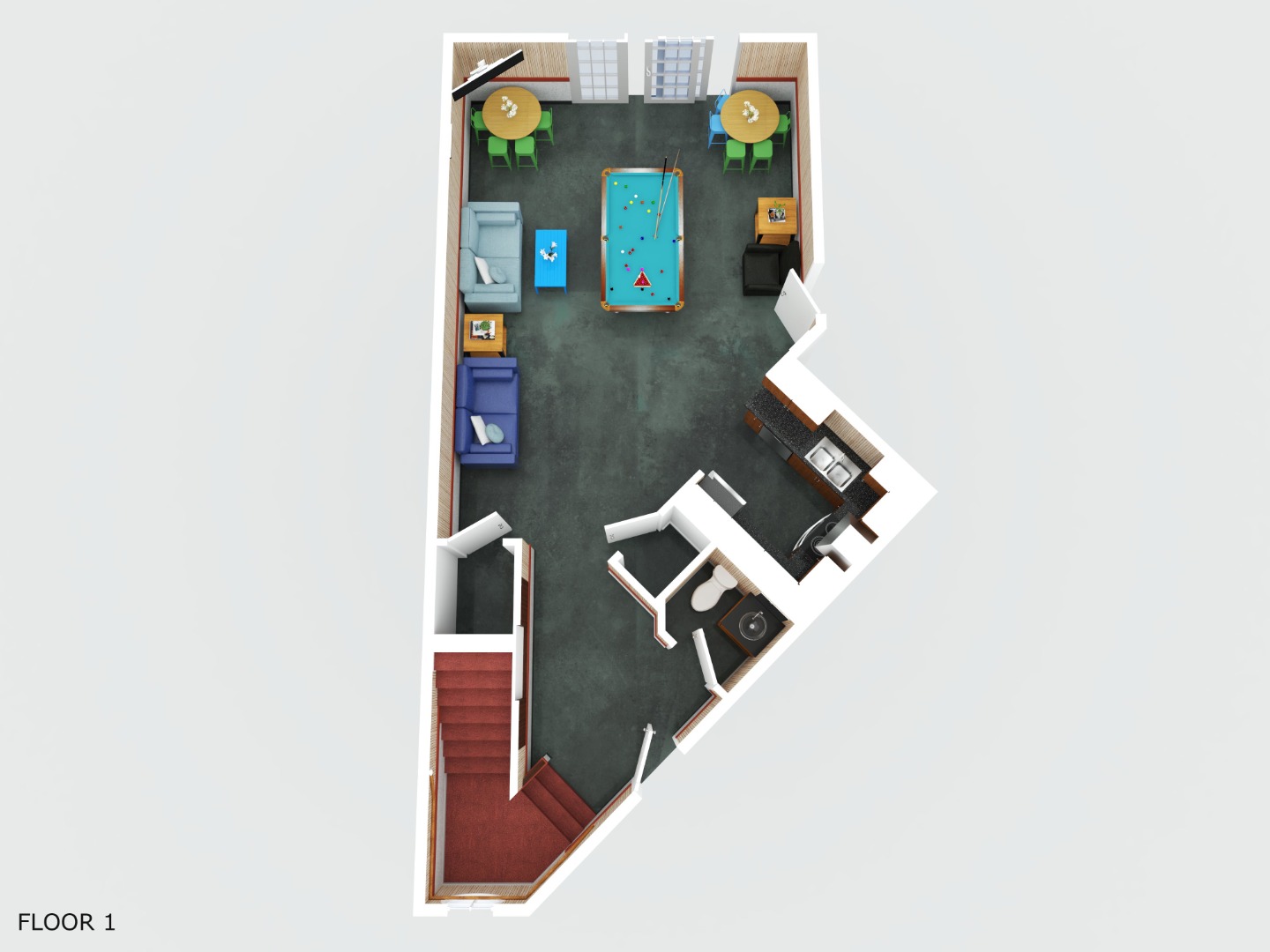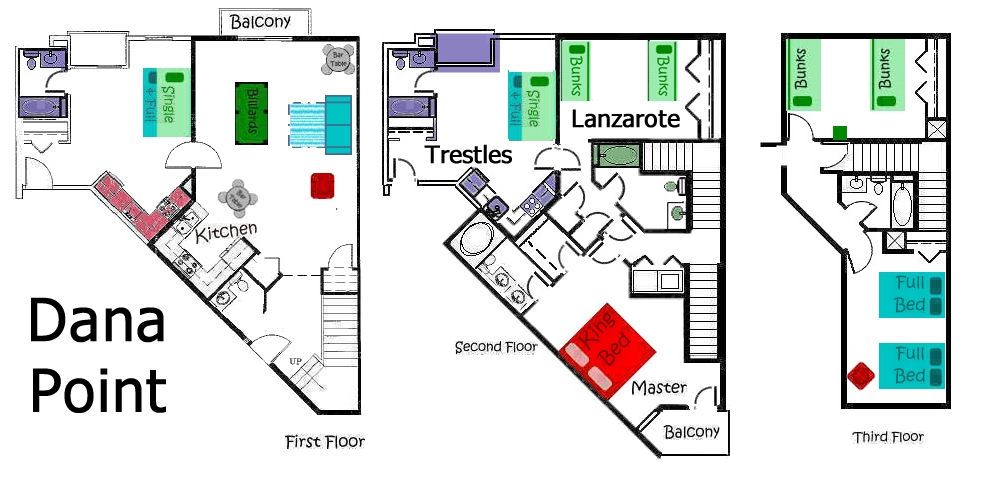 Dana Point is a 3 bedroom unit that sleeps 12 people and has a pool table. There is a bunk room and 2 studios we can add on to make it 6 bedrooms, 4.5 bathrooms & 3 kitchens. We can even do smaller groups of 7 or 4 in the studios alone. Just let us know what size your group is and we will make it work. One 55" smart TV on main floor living room and each studio has one 32" smart TV for you to use your accounts to stream tv (no cable)*All units have similar furnishings photos may not be of the exact unit*