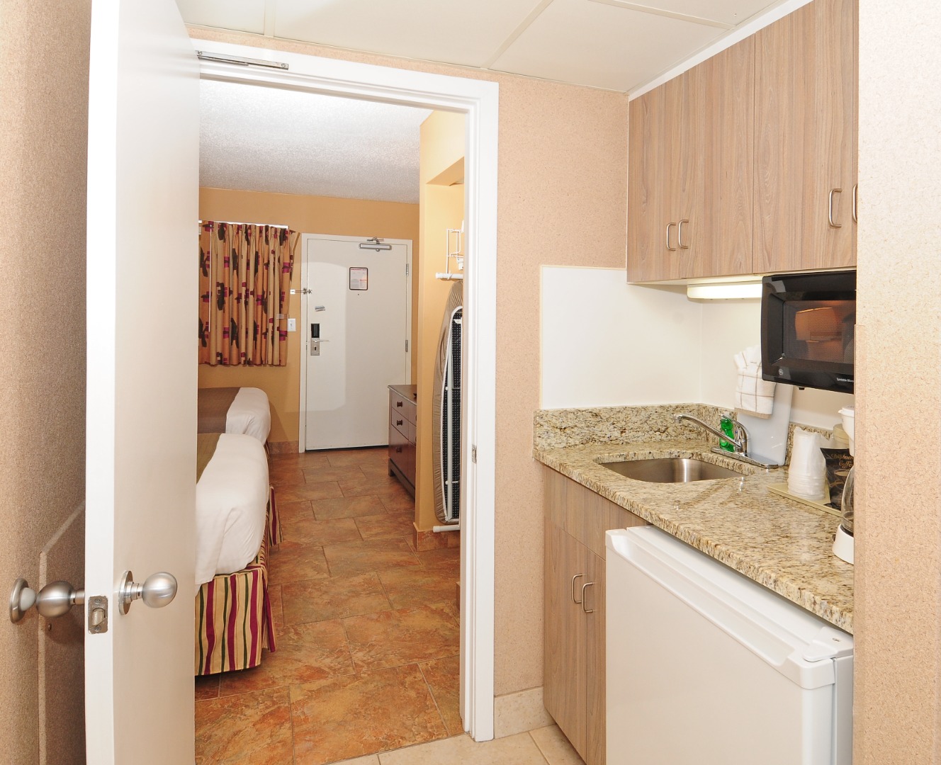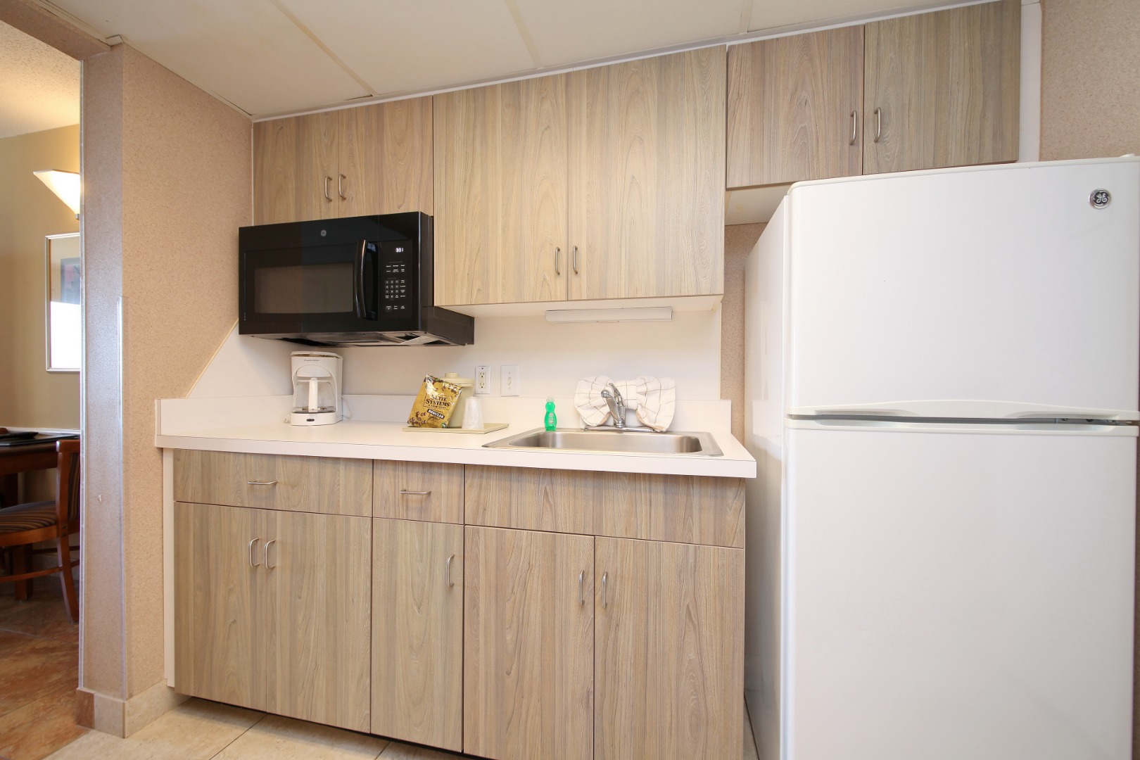 6 person room has 2 TVs and a small kitchenette with a microwave, coffee maker, and refrigerator. An in-room safe and full-size ironing board and iron are also included.