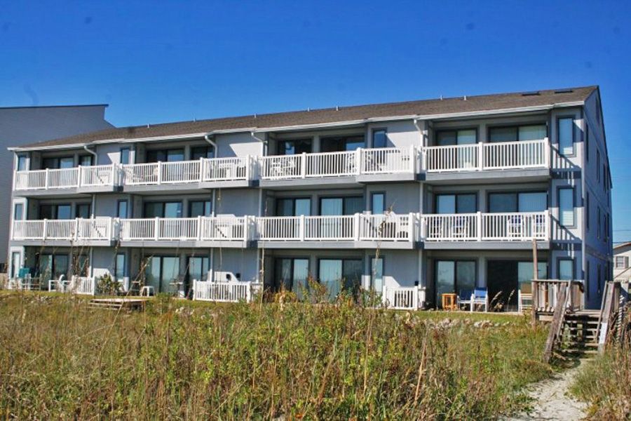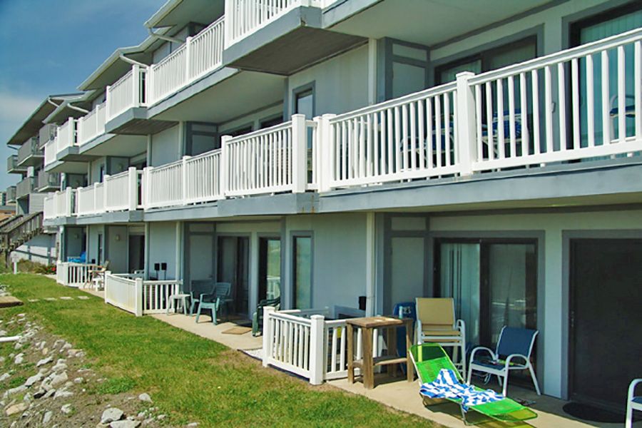 A low profile beachside condo complex where you can enjoy the sights and sounds of the surf from your private oceanfront balcony. This three-story beach retreat has only a dozen condominiums and the first-floor condos have a convenient ground-level entry. There is not a pool and there will be a sleeper sofa or inflatable bed.
