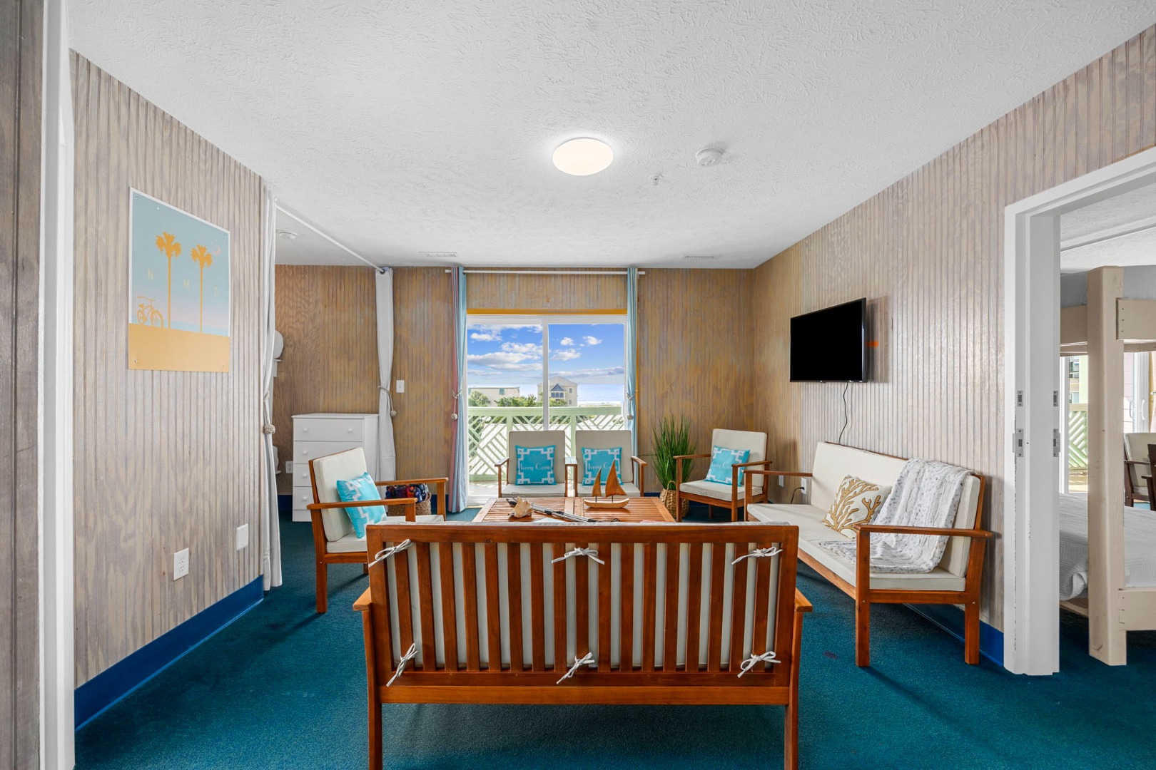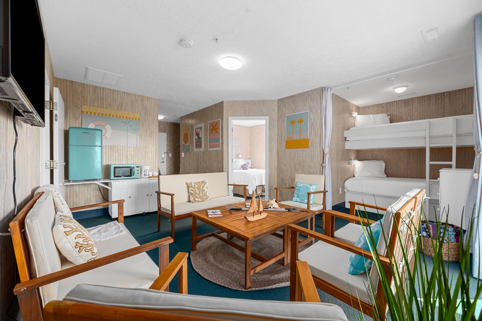 Pelicans Foot Suite is just a half block from the beach and a block from the restaurants and shops of Ocean Drive. Two private bedrooms with queen beds and a slew of bunks and twin beds for single sleepers mean everybody canhave their space.