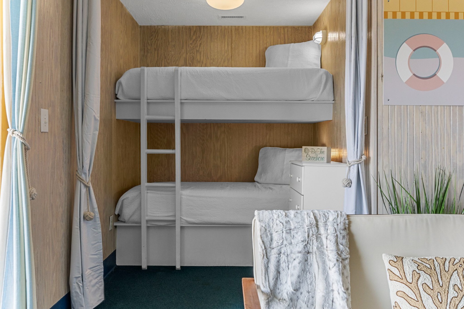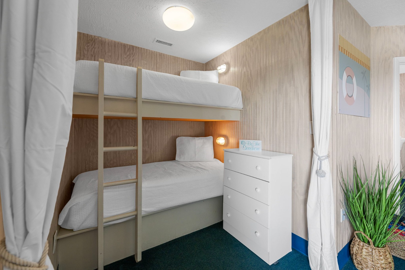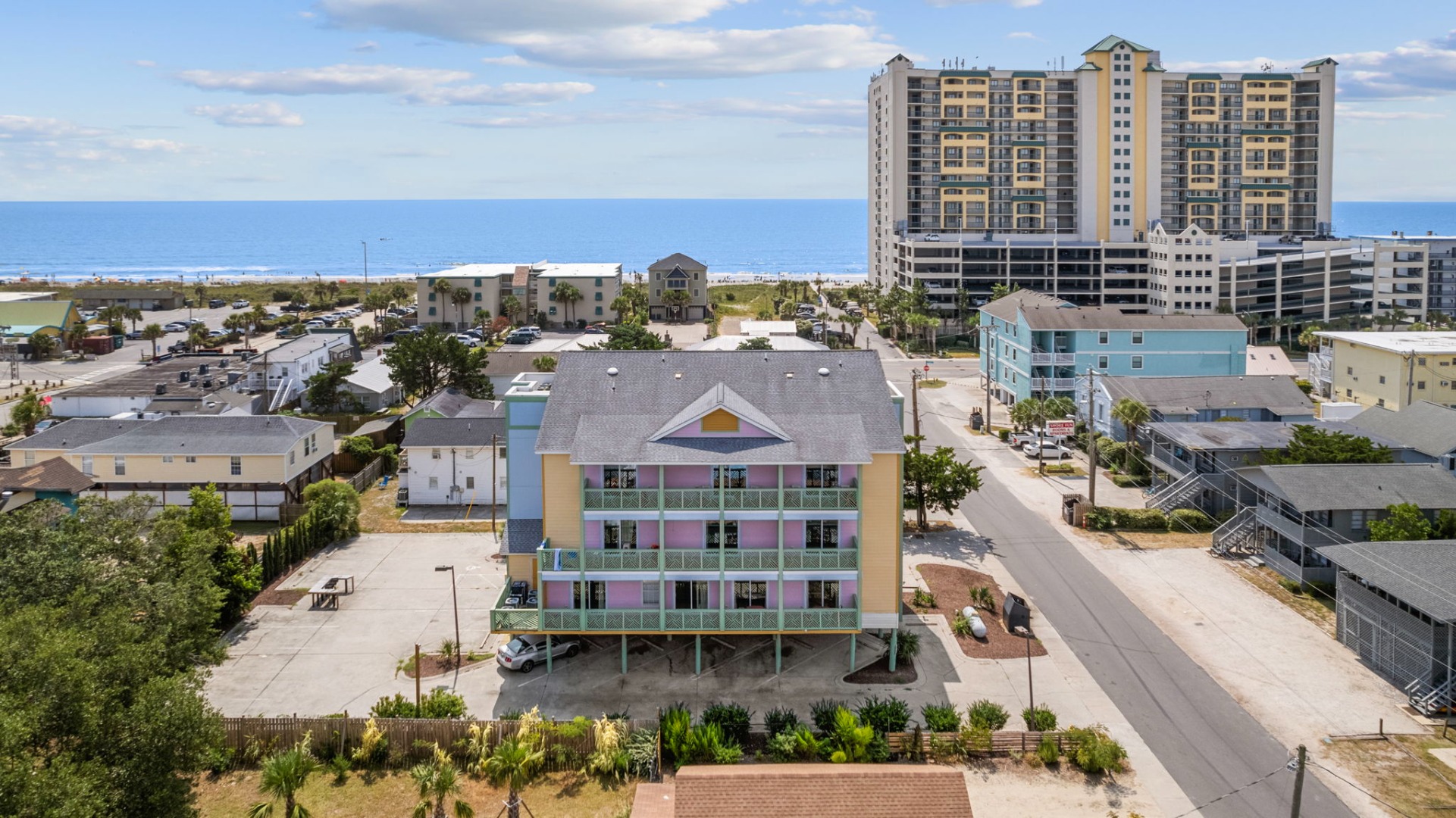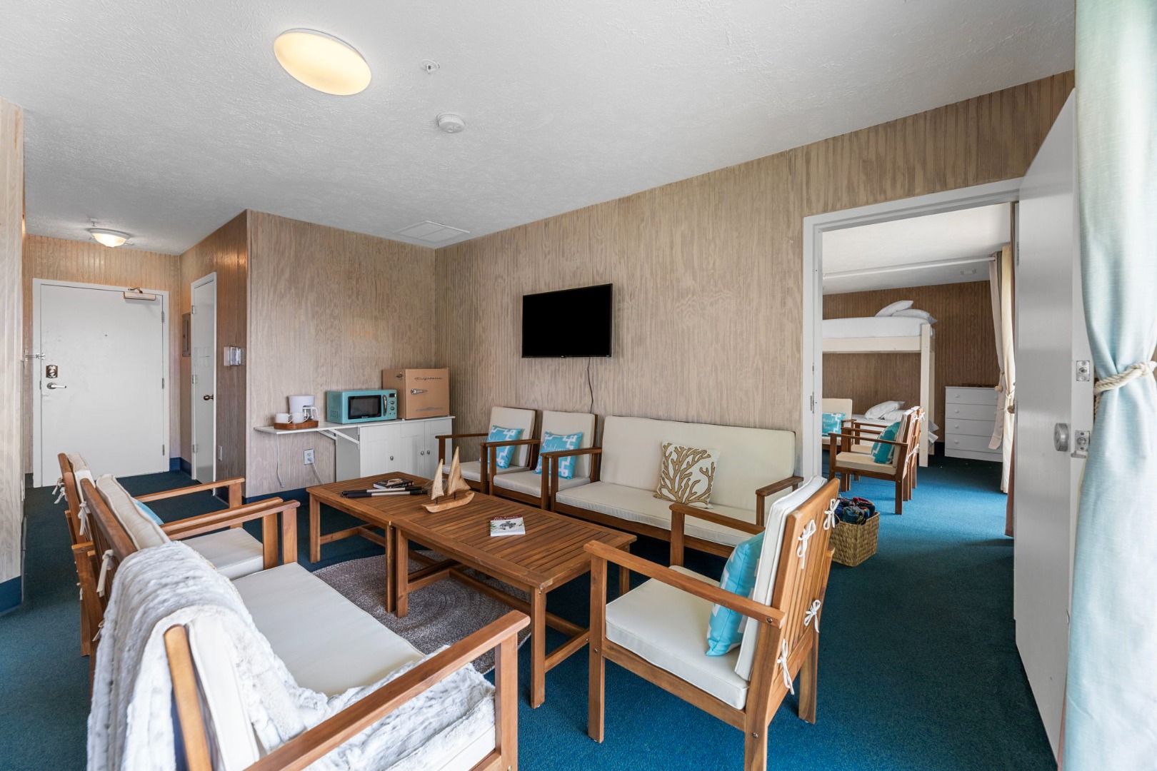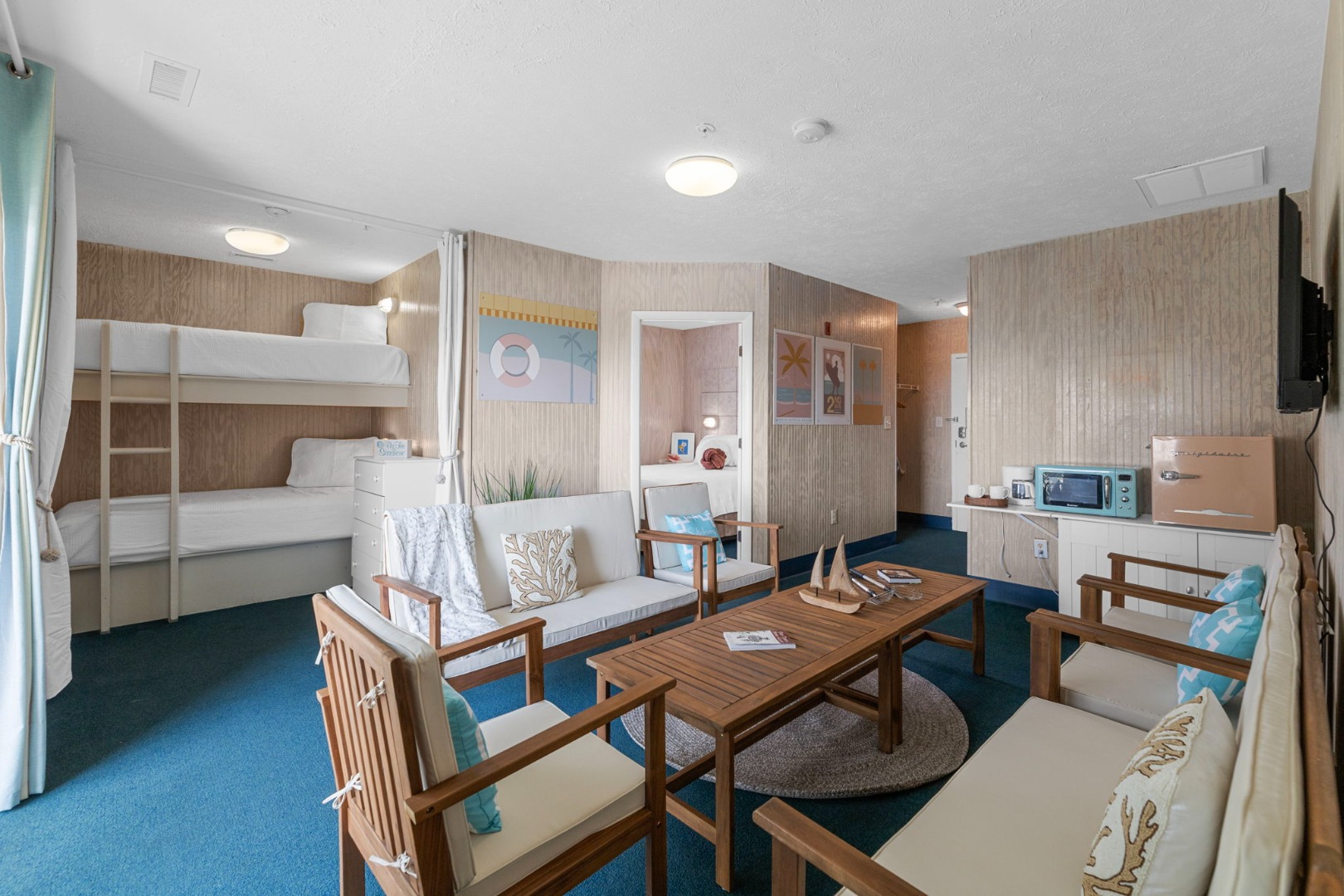 Lettered Olive Suite is just a half block from the beach and a block from the restaurants and shops of Ocean Drive. Two private bedrooms with queen beds and 4 sets of twin bunks and 6 twin moveable beds.