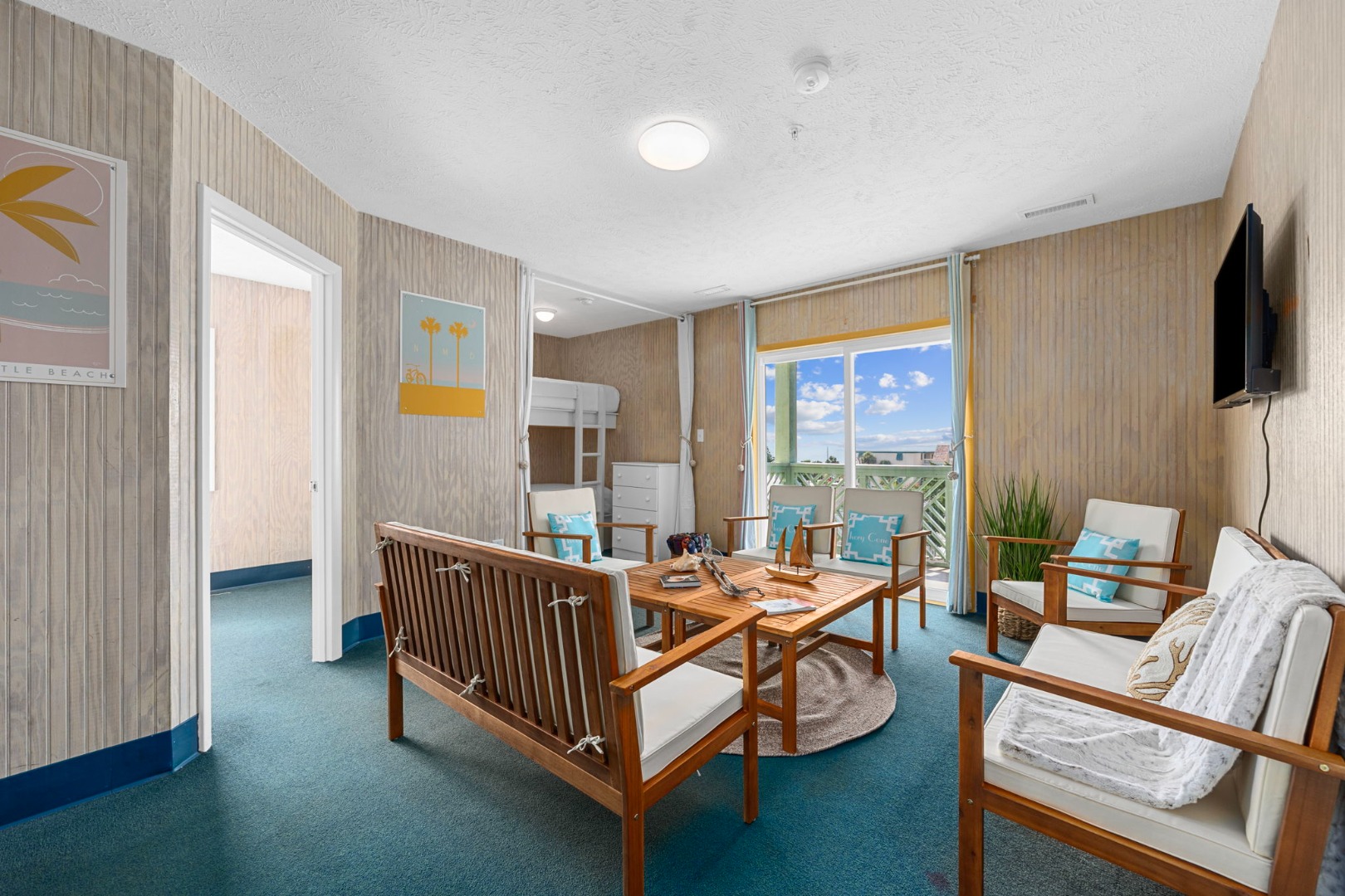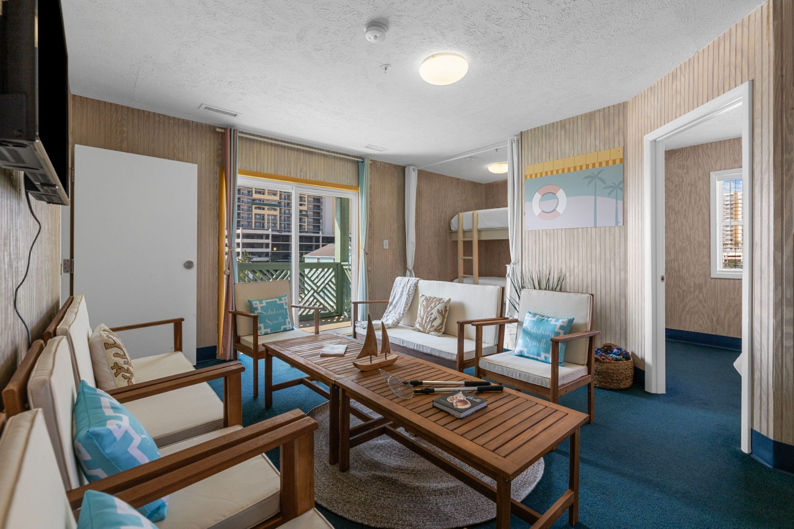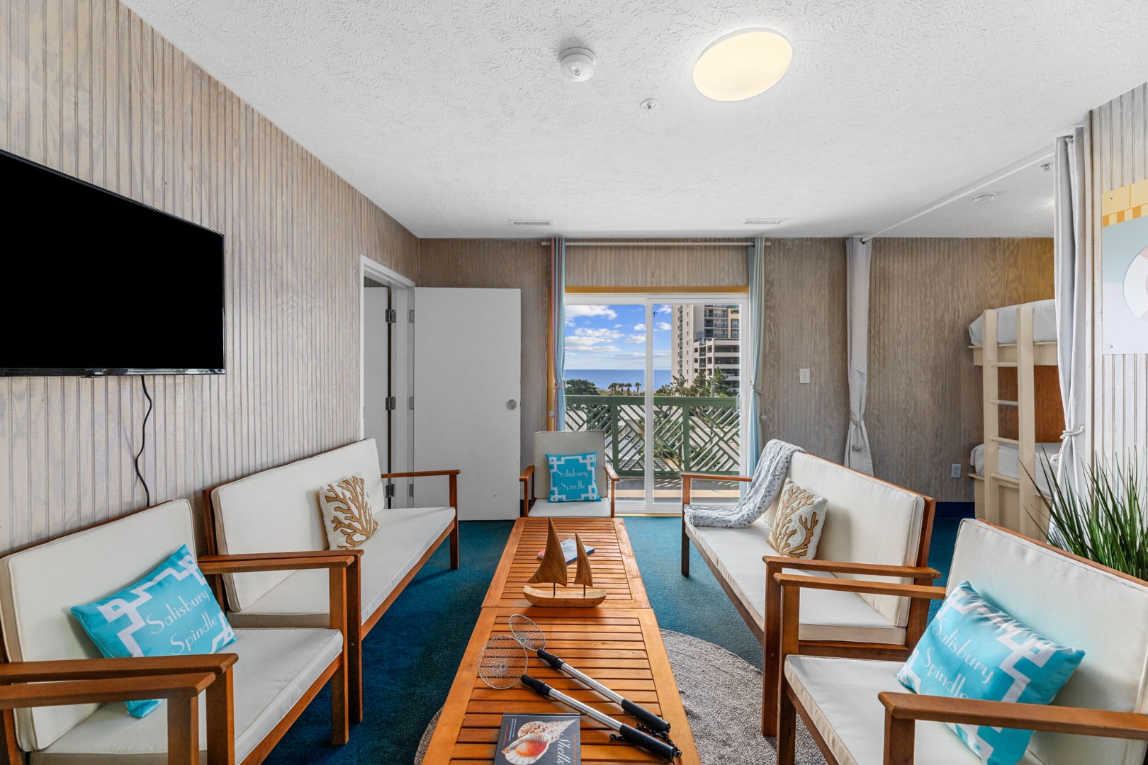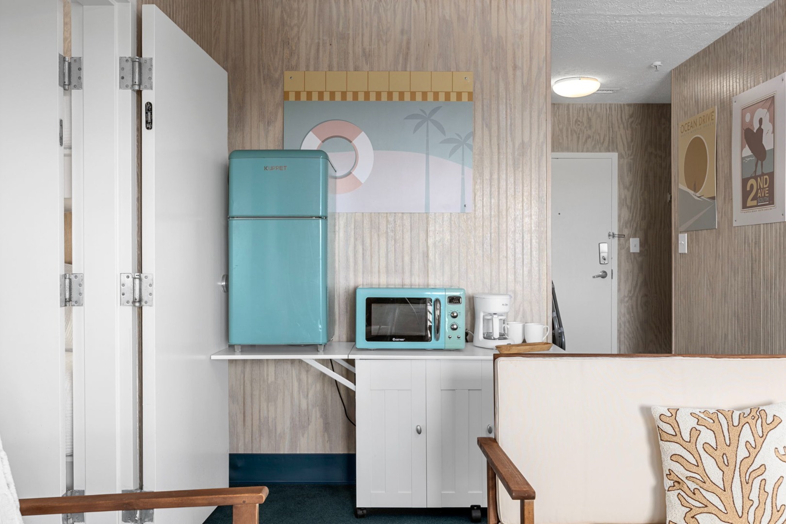 Lettered Olive Suite is just a half block from the beach and a block from the restaurants and shops of Ocean Drive. Two private bedrooms with queen beds and 4 sets of twin bunks and 6 twin moveable beds.