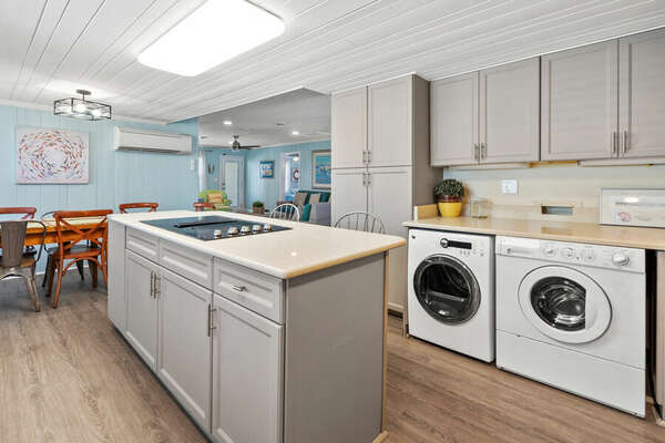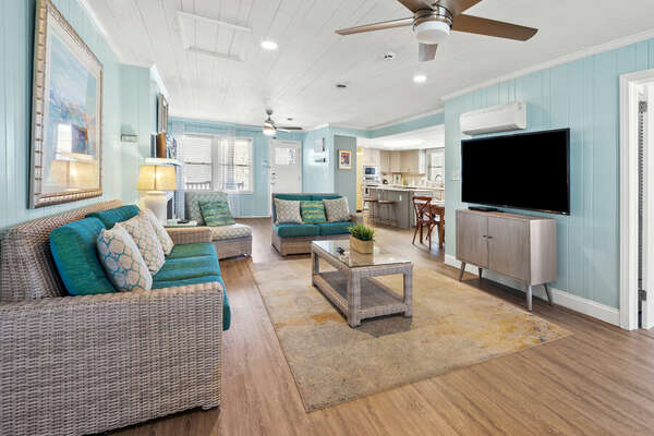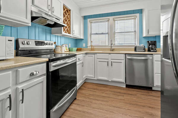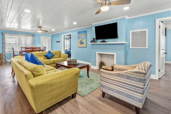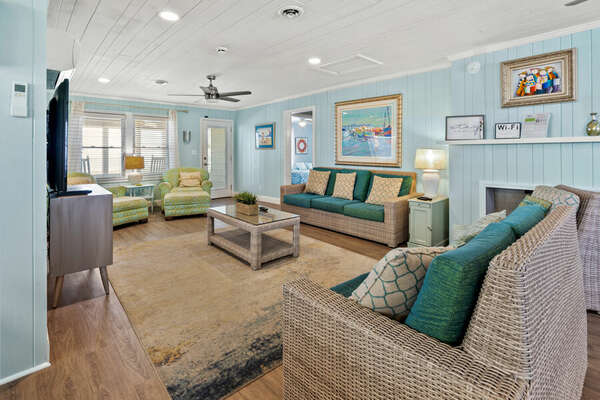TWO FULL KITCHENS and two full living rooms make this home ideal for family and friends for any occasion. Also, there are charcoal grills, patio sets, and a picnic table for outdoor dining. The home is well equipped with flat-screen TVs and Wi-Fi. This is a non-smoking vacation accommodation, and motorcycles are welcome.