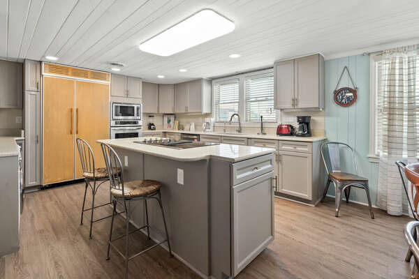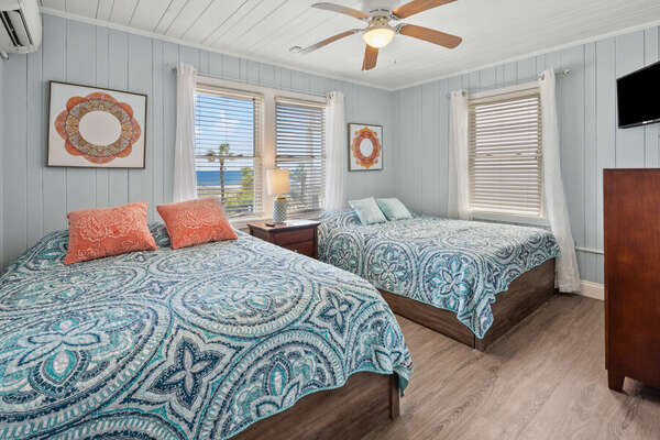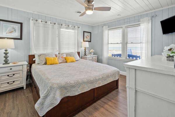 Bedrooms 1 and 2 have ocean views, while bedrooms 5 and 6 overlook the dunes and pool. Please note that the upstairs and the downstairs of the home do not have interior access between the two. The Retreat bedroom and sitting room are in a separate building with their own private exterior access.