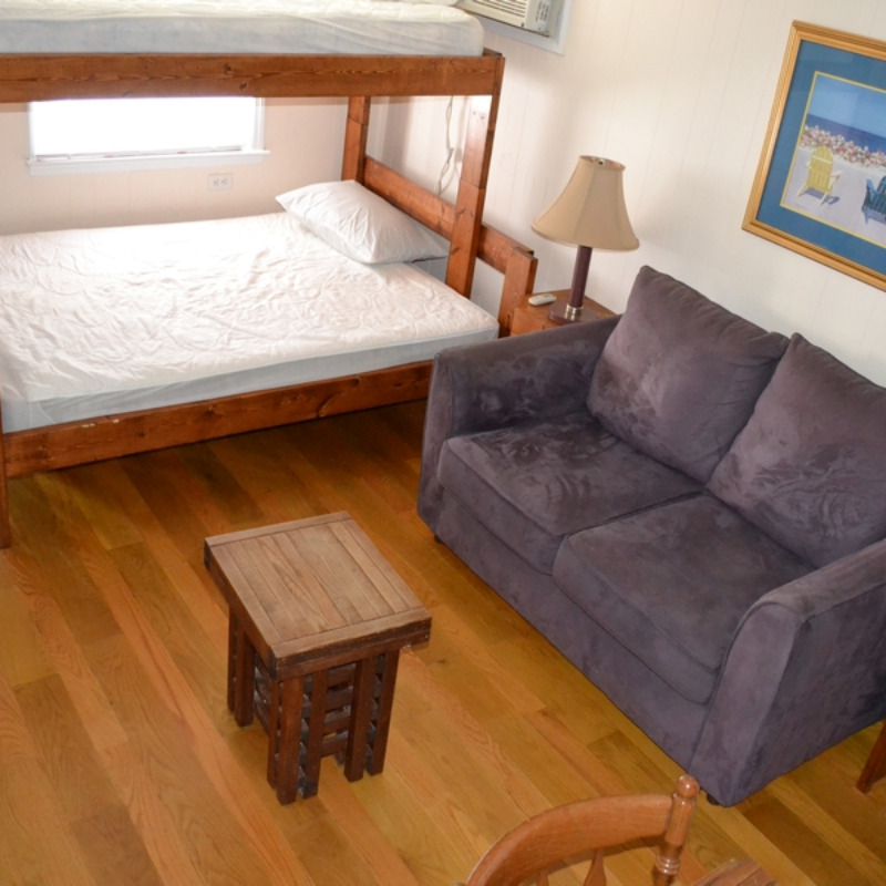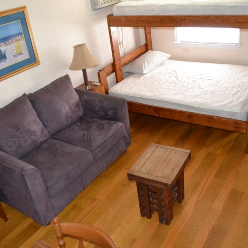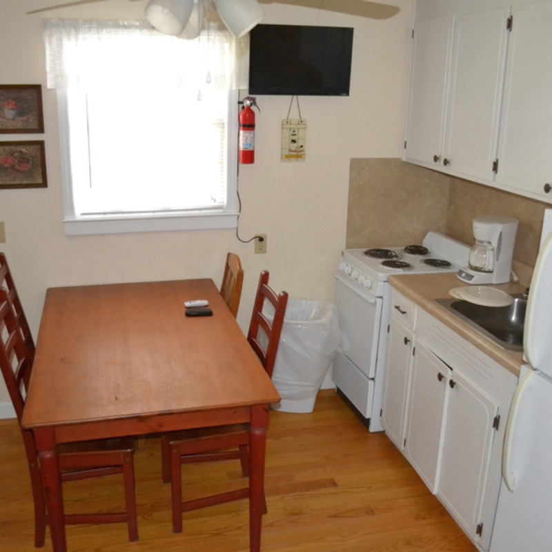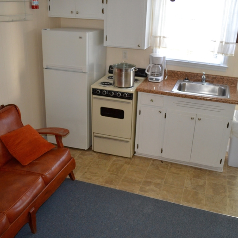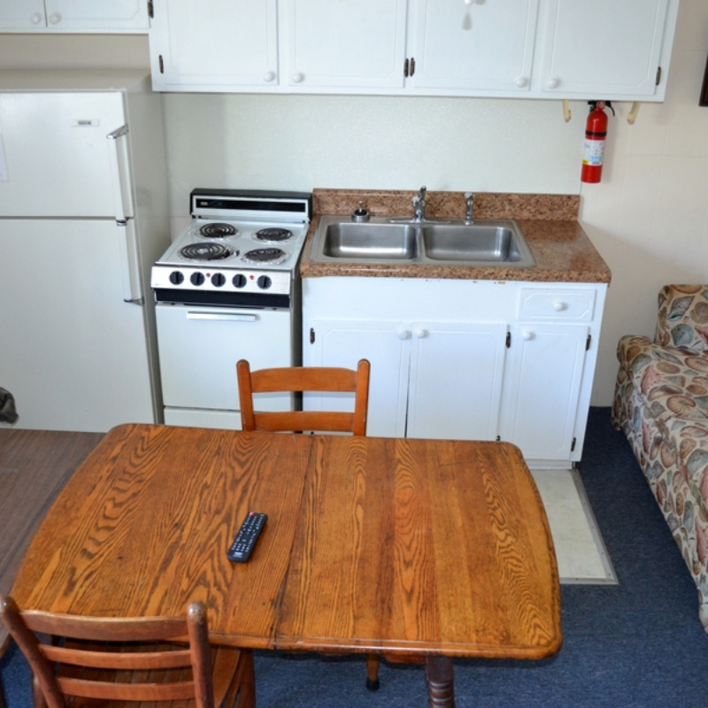 All Efficiency Units have a kitchen including stove/oven, small refrigerator, microwave, coffee pot, toaster, pots and pans, utensils, plates, etc. as well as a small sofa, cable TV and bunkbed w/ double bed on bottom and a single bed on top.