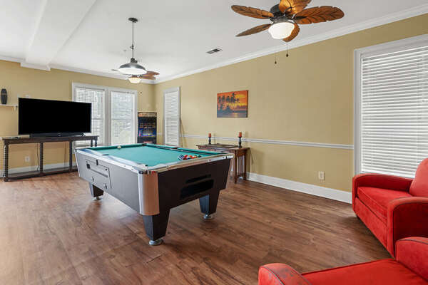 - Game room w/ pool table, video games, poker table, and 65" TV