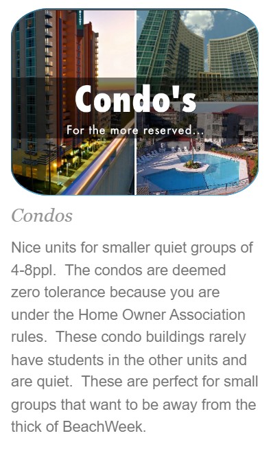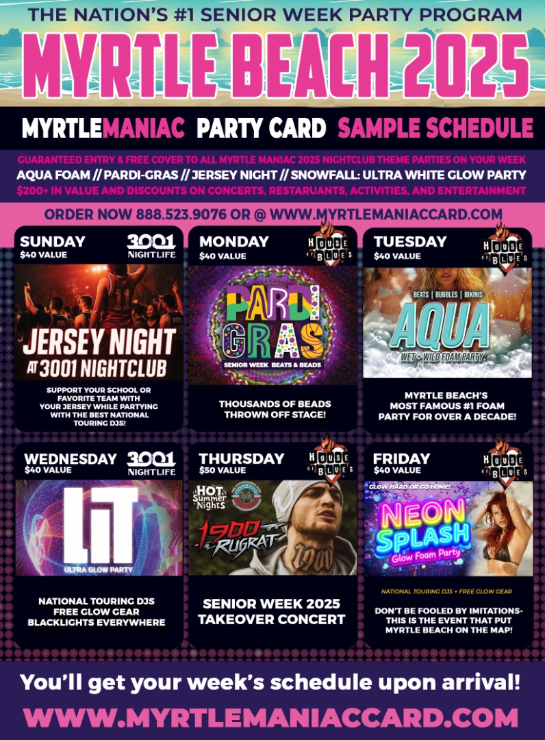 For over 30 years we have provided housing to all students celebrating the "Hassle for the Tassle"! As you spend your days making memories that last long after the tan fades away, we also help you drift through the moonlight more easily, we offer you a discounted half price for a pre ordered Myrtle Maniac Card thru us in the Myrtle Beach Tours Shore Store. Don't forget your