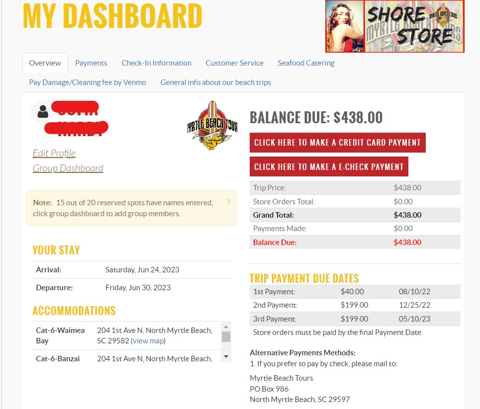 Individual password-protected accounts for each guest to make payments individually. All the group leader has to do is enter the list of names, then oversee progress from the groupleader dashboard...