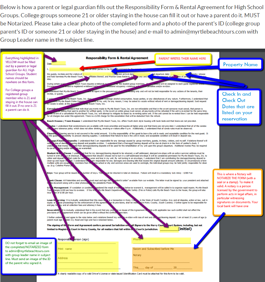 Below is how a parent or legal guardian fills out the Responsibility Form & Rental Agreement for High School Groups. College groups someone 21 or older staying in the house can fill it out or have a parent do it. It MUST be Notarized. Please take a clear photo of the completed form and a photo of the parent's ID (college group parent's ID or someone 21 or older staying in the house) and Up-Load them into the Group Dashboard. We require only one responsibility form in order to check in and it must be submitted within 10 days of booking along with a pic of the parent's (Or 21 yr old college student's ID). Group leaders can ask all parents to participate and up-load responsibility pages individually, however, we only require one. Please be sure to review them for accuracy before submitting them.